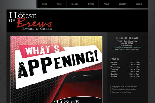 House of Brews needs to promote regularly changing events, as well as an evolving menu. The Wordpress CMS allows them to make easy changes to common elements of the site. Events automatically expire, so they don't have to worry about removing them once they pass.